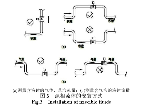 渦街流量計在(zai)管道上可以水平(píng)、垂直或傾斜安裝(zhuāng),但測量混相流體(ti)時,測量精度得不(bu)到保障,需保證測(ce)量流體充滿管道(dào),避免産生混相流(liú),根據混相流體的(de)特點,選擇合适的(de)安裝方式,具體的(de)安裝方式如圖3所(suo)示。