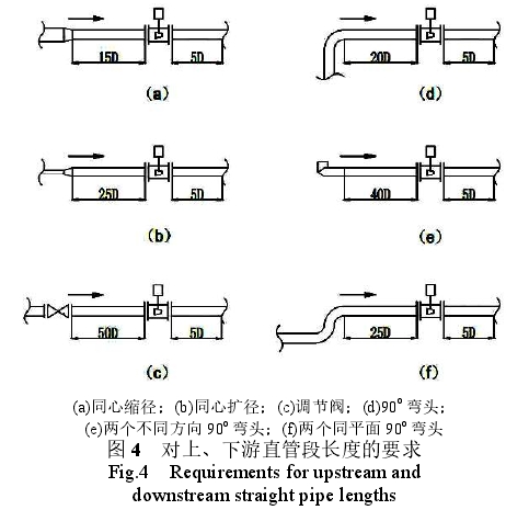 渦街流量計必(bì)須在穩定的流束(shu)場内,有一.定的直(zhí)管段要求,直管的(de)長度會影響精度(du),必須保證上、下遊(you)直管段有一定的(de)長度,通常是.上遊(yóu)直管段>10D,下遊直管(guan)段> 5D,還要結合現場(chǎng)安裝情況進行調(diao)整,如果_上遊有彎(wān)頭或者閥門,直管(guan)段相應的需要加(jiā)長,具體的安裝要(yao)求如圖4所示。