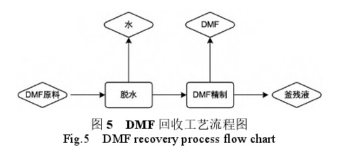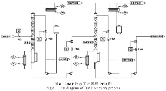 DMF回收(shōu)工藝過程爲: DMF原料(liào)進入脫水塔,塔頂(dǐng)脫除.水分,塔釜采(cai)出水分合格的DMF至(zhì)DMF精制塔,DMF精制塔塔(tǎ)頂采出合格的DMF,塔(ta)釜排出少量廢液(yè)去處理,工藝流程(cheng)見圖5。