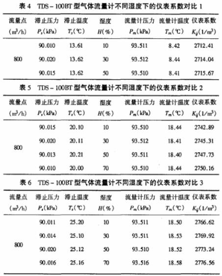 由于環(huan)境條件(jiàn)的影響(xiǎng),不同時(shi)間段對(dui)流量計(jì)進行檢(jiǎn)😘定,其環(huan)境濕度(du)是不一(yi)樣的。我(wǒ)們以TDS-100BT型(xing)氣體流(liú)量👅計爲(wèi)例,針對(dui)某一流(liú)量點,在(zài)不同濕(shī)度、不同(tóng)溫度下(xià)分别進(jin)行試驗(yan),通過檢(jian)定,得出(chū)✊的試驗(yan)數據如(ru)表4~表6所(suǒ)示。