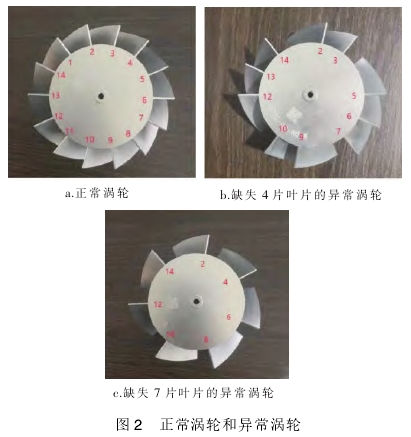 正(zheng)常流量計的渦(wo)輪葉片有14片,制(zhi)作葉片缺失4片(piàn)和缺失7片的異(yì)常渦輪,置于流(liu)量計内,進行對(dui)比實驗。正常渦(wō)輪和異常渦輪(lun)見圖2。實驗過程(chéng)中渦輪拆除更(gèng)換均由專業技(jì)術人員操作。