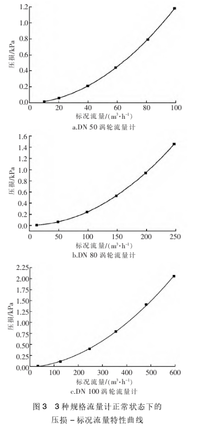 通過(guo)上述分析可以(yi)看出,渦輪流量(liang)計的壓損與标(biāo)況流量成二次(cì)函數關系。當渦(wō)輪流量計異常(cháng)時,壓損-标況流(liu)量特性曲線将(jiāng)偏離正常曲線(xian)。