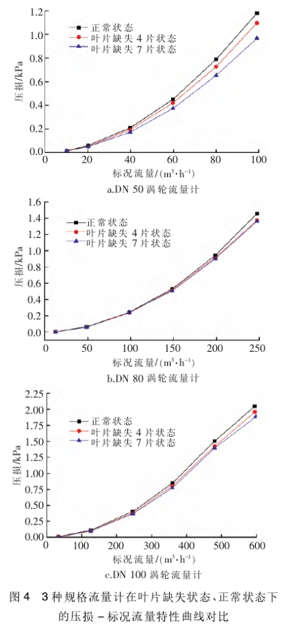 圖4爲DN50、DN80、DN100渦輪流量(liàng)計葉片缺失4片(pian)狀态、葉片缺失(shi)7片狀态與正常(cháng)狀态的壓損-标(biāo)況流量特性曲(qu)線對比。可以看(kan)出,對每種規格(gé)的渦輪流量計(jì),在相同流量情(qing)況下,葉片缺失(shi)狀态的壓損比(bǐ)正常狀态小,葉(yè)片缺失越多,壓(ya)損越小。壓損減(jian)小值随着流量(liàng)增大而增大,小(xiǎo)流量下的壓損(sǔn)減小值難以識(shí)别,大流量下的(de)壓損減小值也(yě)不顯著,但.當流(liú)量足夠大時,采(cai)用工業級别壓(ya)差傳感器可以(yǐ)識别。在實際運(yùn)行中,由于大流(liú)量下的壓損減(jian)小值不顯著,可(ke)能導緻較多誤(wu)判,因此需要結(jié)合流量計的高(gao)低頻脈沖數進(jìn)一步判定。