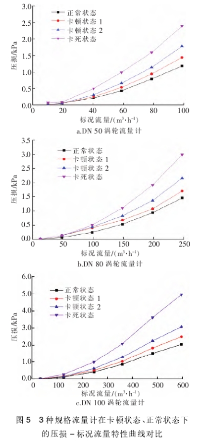 圖(tu)5爲DN50、DN80、DN100渦輪流量計(jì)卡頓狀态、正常(chang)狀态的壓損-标(biao)況流量特性曲(qu)線對比。可以看(kan)出,對每種規格(ge)的渦輪流量計(jì),當軸處于卡頓(dùn)狀态時,相對于(yú)正常狀态,相同(tóng)流量下的壓損(sǔn)變大,卡頓程度(du)越大,壓損越大(dà);壓損增大值随(suí)着流量增大而(er)增大。卡死狀态(tài)與正常狀态相(xiàng)比,壓損顯著增(zēng)大,最大流量下(xia)DN50、DN80、DN100渦輪流量計的(de)壓損分别爲正(zhèng)常狀态下壓損(sun)的2.0、2.1、2.4倍。