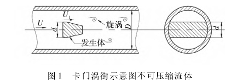 渦(wo)街流量計依據(ju)的基本原理爲(wei)“卡門渦街”原理(li)。具體來講,在測(cè)量管道中垂直(zhí)地插入一-段非(fēi)流.線型阻流體(ti)稱之爲旋渦發(fa)生✨體,來流流體(ti)流過發生體,當(dāng)管道内雷諾數(shù)達到--定值時,在(zài)發生體下遊兩(liǎng)側會交替分離(lí)出規則排列的(de)旋渦,這種現象(xiang)稱爲卡門渦街(jiē)現象,如圖1所示(shi)。在一定雷諾數(shu)㊙️範圍内旋渦脫(tuo)落頻率與發生(sheng)體兩側的平均(jun)流速的關系✉️可(kě)表示爲中: