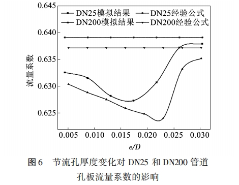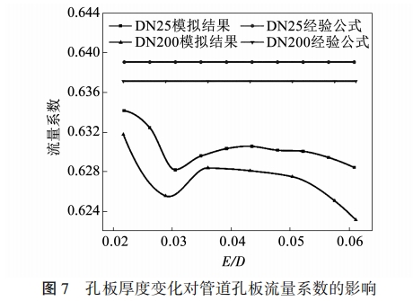 本文在(zai)保持節(jie)流孔厚(hou)度不變(bian)的情況(kuàng)下,分别(bié)設置了(le)不同的(de)孔闆厚(hòu)度用以(yi)探究流(liú)量系數(shù)的變化(huà),其中DN25管(guan)道孔♌闆(pǎn)厚☁️度E爲(wèi)0.5~1.4mm,DN200管道孔(kong)闆厚度(du)E爲3~8mm,模拟(ni)結果如(ru)圖7所示(shì)。