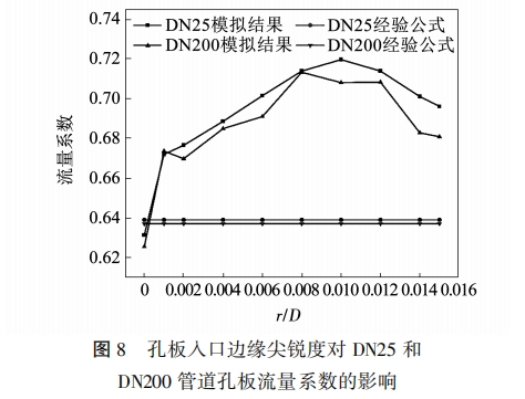 一般而(ér)言,孔闆(pan)人口邊(bian)緣應該(gāi)是尖銳(rui)的,其與(yu)超臨界(jiè)二氧化(hua)🐕碳工質(zhi)首先直(zhi)接接觸(chù),如果其(qí)尖銳度(dù)不夠的(de)話則無(wu)法保證(zheng)對于工(gong)質的節(jie)流作用(yòng)達到預(yù)期,因而(er)會對測(cè)量精度(du)産生影(ying)響。在孔(kǒng)闆實際(jì)工作過(guo)程:中,可(ke)能存在(zai)加工精(jing)度不足(zu)、工質磨(mó)損、腐蝕(shi)等問題(tí)的存在(zài)🙇🏻,造成直(zhi)角邊🤞緣(yuan)變鈍,故(gu)标準文(wen)件[10]規定(ding),孔闆人(rén)口邊緣(yuán)的圓弧(hu)半徑應(yīng)小于等(deng)于0.0004D,在此(cǐ)限值之(zhī)内的誤(wù)♋差是可(ke)以接受(shòu)的,若超(chāo)過這一(yī)-限值,則(zé)無法保(bao)證測量(liang)精度,應(ying)進行相(xiang)應的維(wei)修、更換(huàn)或修正(zhèng)等。本文(wén)模拟了(le)孔闆人(ren)口邊緣(yuan)圓弧半(ban)徑爲0~0.015D時(shí)✉️孔闆的(de)流量系(xì)數變化(hua)趨勢,結(jie)果如圖(tú)8所示。