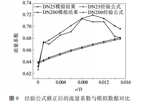 可以看(kan)出,當使(shi)用更正(zheng)後的修(xiu)正系數(shù)b進行孔(kong)闆的流(liu)量系數(shù)經驗公(gong)式計算(suan)結果的(de)修正後(hou),得到的(de)流量系(xì)數與模(mo)拟結果(guǒ)拟合較(jiào)好,其中(zhong)DN25管道相(xiang)對誤差(chà)爲0.11%~1.21%,DN200管道(dao)相對誤(wu)差爲0.11%~1.85%。