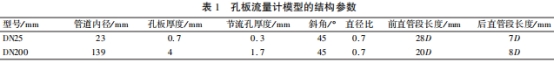 根(gen)據标準(zhǔn)文件[1]規(guī)定的孔(kong)闆流量(liang)計結構(gòu)設計與(yu)參數要(yao)求,本文(wen)🍓分别建(jiàn)立了DN25和(he)DN200兩種管(guan)徑的孔(kǒng)闆流量(liang)💃🏻計,結構(gòu)參數如(rú)🏃表1所示(shi),在後文(wén)進行相(xiang)關研究(jiū)時均🐕以(yi)該表中(zhong)的結構(gòu)參數🌏爲(wèi)基礎參(can)數,依據(ju)該參數(shu)使用SolidWorks軟(ruǎn)件建立(lì)了孔闆(pan)流量計(ji)及其前(qián)後一定(ding)長度管(guan)道的幾(ji)何模型(xing),如圖2所(suǒ)示👄。