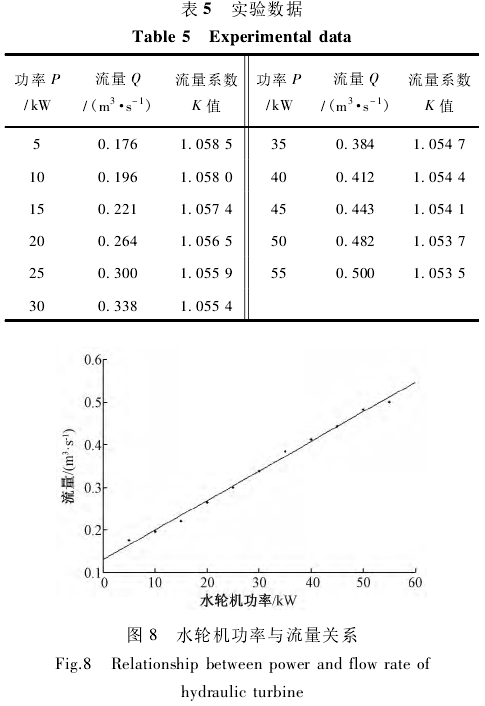 通過效(xiao)率試驗測得(dé)相關數據,在(zài)實驗中改變(biàn)出力P來測流(liú)量Q,并根據上(shàng)述分析得到(dao)了流量系數(shu)K值,數據如表(biao)5所示,水輪機(jī)功率與流量(liang)的關系如圖(tu)8所示。