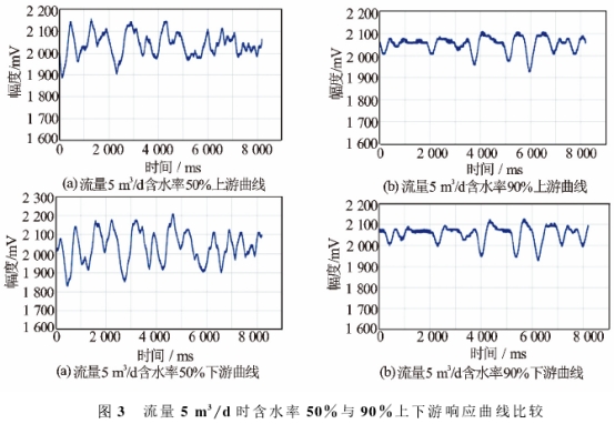 如圖3所示,選取(qu)流量爲5m3/d、含水率分(fèn)别爲50%與90%的上下遊(you)曲線進行💋分🔴析。從(cóng)圖3中可以看出,不(bu)同含水率下,測得(de)的上下遊曲🌍線中(zhong),對應👄響應波形的(de)時間差是相等的(de)。但🈚是低含水率下(xià),響應頻率比較高(gāo),高含水率下,響應(yīng)頻率比較低,這就(jiu)說明,這種傳感器(qi)獲取的流量信息(xī)隻與時間有關,而(ér)與含水率的多少(shǎo)無關。