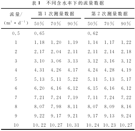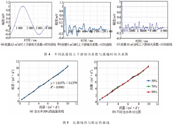 根據渡越時(shi)間與流量關系,将(jiāng)測得渡越時間換(huàn).算爲流量數據,得(de)到表1。從表1中可以(yǐ)看出,各個含水率(lü)下的測量數據與(yu)标準數據之間的(de)差别不大,含水率(lü)的影響可以♻️忽略(luè)不👄計,第1次測量數(shù)據和第2次測量數(shu)據之🚶間吻合比📞較(jiao)好。對表1中的數據(jù)進行分析,得到圖(tu)5。圖5(a)對含水率50%的各(ge)個流量數據進行(háng)了拟合,得到了拟(nǐ)合曲線和方程,在(zài)0.5~10m3/d的線性度良好,能(néng)達到0.99,圖5(b)對不同含(han)水率下的各個流(liú)量點進行重疊,可(ke)以看出在不同含(han)水率下,各個流量(liang)點的測量數據與(yǔ)複測數據吻合,具(jù)有很好的重複性(xìng)和穩定性。