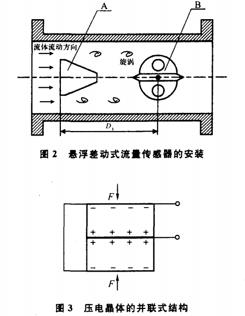 在渦(wō)街流量計(ji)中,懸浮差(cha)動式流量(liàng)傳感器的(de)安裝如圖(tu)2所示,傳感(gǎn)器B安裝在(zài)旋渦發生(shēng)體A的後面(miàn).傳感器的(de)軸線與旋(xuan)渦發生體(tǐ)平行,整個(ge)傳感器都(dōu)沉浸在流(liu)體中[5].圖中(zhong)的懸浮式(shì)差動傳感(gǎn)器在設計(jì)中使用了(le)4個壓💔電晶(jing)體作爲檢(jian)測元件,在(zai)平闆兩側(ce)對稱固定(ding)了兩個檢(jian)測單元,以(yi)形成差動(dong)結☎️構.每個(gè)檢測單元(yuán)外形爲一(yī)個半圓柱(zhu)型殼🔱體,殼(ké)體内具有(you)與平闆軸(zhou)線平行的(de)通孔,通孔(kǒng)内有兩個(gè)尺寸、質量(liàng)和靈敏🌈度(dù)系數都相(xiàng)同的壓電(dian)陶瓷片,兩(liang)壓⚽電陶瓷(cí)片之⭐間由(you)一金屬質(zhì)量塊相連(lian),該質🎯量塊(kuai)與兩壓電(dian)陶瓷片焊(han)接在一起(qi)組🈲成一個(ge)剛體.金屬(shu)質量塊同(tong)時也作爲(wèi)壓電陶💃瓷(cí)的輸出電(dian)🈲極,引出檢(jian)測信号給(gěi)電荷放大(da)電路.兩片(piàn)壓電晶體(tǐ)采用并聯(lián)式結構,如(ru)圖3所示,使(shi)輸出🌈電荷(he)量加倍,以(yǐ)達到增大(dà)渦街流量(liang)信号✂️的目(mu)的.