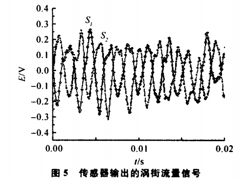 如(rú)圖3所示,當(dāng)旋渦流經(jīng)傳感器時(shí),旋渦産生(sheng)的交變壓(ya)力作用在(zài)兩個檢測(ce)單元的彈(dan)性膜片上(shàng),使兩側👣的(de)壓電陶瓷(cí)片交替産(chan)生電荷.兩(liǎng)個檢測單(dān)元會輸出(chū)帶有噪聲(sheng)的正弦信(xin)号Si與S2,如♋圖(tú)5所示♻️.由于(yu)兩個檢測(ce)單元的對(dui)稱性,使得(de)St與S2信号中(zhong)所含的渦(wo)街流量信(xìn)号的幅值(zhí)與頻率相(xiàng)同📱、相位相(xiang)差180°;又因爲(wei)管道振動(dòng)、流場脈動(dong)等💁引起的(de)幹擾振動(dong)對兩側的(de)壓電陶瓷(cí)片的作用(yòng)是一緻的(de),所以S1與S2信(xin)号中所含(han)幹擾信号(hao)爲幅值、頻(pin)率與相位(wei)都相同的(de)共模信👈号(hao).在采用🆚差(chà)動式電荷(he)放大前置(zhì)放大電路(lu)中,輸出信(xin)号隻含有(you)差模信号(hào)S1-S2,從而有效(xiao)地抑制了(le)振動幹🧑🏾🤝🧑🏼擾(rǎo).