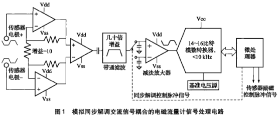 因其口徑(jìng)範圍寬,量(liàng)程大,精度(dù)高,無壓力(li)損失,可靠(kào)性高等優(yōu)點,在工業(ye)領域得到(dao)廣泛應用(yòng)”。電磁流量(liang)🌈計的工作(zuo)原理是法(fa)💞拉第電磁(cí)感應定律(lǜ)。導電流體(ti)流過傳感(gǎn)器工作磁(cí)場時,在測(cè)量管壁與(yǔ)流動方向(xiang)和磁場方(fang)向相互垂(chuí)直的一對(duì)電極間,産(chǎn)生與流速(sù)成比例的(de)電動勢。電(dian)動勢的大(da)小可表示(shì)爲E =kBDʋ,式中,E爲(wèi)♈感應信号(hao)電勢; k爲常(chang)數; B爲磁感(gan)應強度; D爲(wèi)測量☔管内(nèi)徑;ʋ爲測量(liàng)管内電極(ji)斷面軸線(xiàn)方向平均(jun1)流速。電磁(cí)流量計由(yóu)電磁流量(liàng)☀️傳感器和(he)電磁流量(liang)轉換器組(zu)成。電磁流(liú)量傳感器(qì)的輸出是(shì)疊加在共(gòng)模信♉号上(shang)的極微弱(ruo)的有用信(xìn)号,通🌂常是(shì)微伏到毫(háo)伏幅值信(xin)号在幾百(bǎi)毫伏到一(yī)、兩伏的共(gong)模信号之(zhi)上。傳感器(qi)内阻可能(neng)從十幾歐(ou)姆到幾十(shi)兆歐姆凹(ao)。從而要求(qiu)轉換器的(de)信号處理(lǐ)電路具有(you)高共模抑(yì)制比,低噪(zào)聲,高輸人(rén)阻抗的特(te)🌈性。目前業(ye)界常用工(gong)頻偶數分(fèn)之-一倍的(de)低頻方波(bo)🈚勵磁的傳(chuan)感器激勵(li)方式",要求(qiu)電磁流量(liang)轉換器能(neng)夠處☂️理傳(chuán)感器輸出(chu)🌈的脈動交(jiao)流信号。交(jiāo)流信号耦(ǒu)合是電磁(cí)流量轉換(huan)器信号放(fang)大電路最(zui)常用的信(xin)号耦合方(fāng)式。