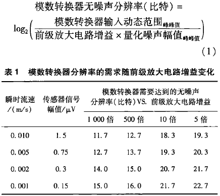 電磁(ci)流量傳感(gan)器的響應(yīng)通常爲150 μV/( m/s)到(dào)200μV/(m/s),因爲調制(zhi)勵磁電流(liu)的換👈向,傳(chuán)感器的輸(shu)出信号幅(fu)值加倍。以(yi)150 μV/( m/s)(300 μV峰峰值)響(xiang)💜應爲例,對(duì)0.3~15 m/s流速的量(liang)程範圍,傳(chuán)感器輸出(chū)信号幅值(zhí)在90 μV峰峰值(zhi)到4.5 mV峰峰值(zhí)之間。保證(zheng)流速信号(hào)被模數轉(zhuǎn)換器正确(que)分辨的最(zuì)低要👨❤️👨求是(shì)出現在模(mó)數轉🈲換器(qi)輸人端的(de)傳感器信(xìn)号幅值不(bu)得🚶大于模(mó)數轉👄換器(qi)噪聲的一(yī)半。模數轉(zhuǎn)換器無噪(zào)聲分辨率(lü)的計🥰算公(gōng)式如❌式(1)所(suǒ)示🧡。瞬時流(liu)🛀速對應的(de)❤️傳感器信(xin)号幅值可(ke)被當作對(duì)模數轉換(huan)器噪聲的(de)最低要求(qiu)。由表1可見(jiàn)前級放大(da)電路增益(yì)越低對模(mo)數轉換器(qì)的無👈噪聲(sheng)分辨率指(zhǐ)标的要求(qiú)🏃🏻♂️越高。這是(shi)20世紀🔞後期(qi)數十年裏(li)在缺少成(chéng)本可負擔(dān)、高分辨率(lü)的模數轉(zhuan)換器👉的條(tiáo)件下,