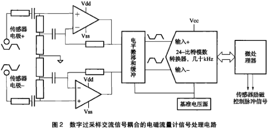 電子進(jin)步使得在(zài)本世紀初(chu)開始出現(xian)越來越多(duo)性🌂價比更(gèng)🔴好的低噪(zào)聲24比特模(mó)數轉換器(qi)産品。随之(zhī)出現的⭐數(shu)字過采樣(yang)交📱流信号(hào)耦合放大(da)是一種改(gǎi)進的電路(lù)結構。如圖(tu)2所示👨❤️👨傳感(gan)器電極輸(shū)出信号使(shǐ)用電容耦(ǒu)合,在前置(zhi)放🍓大級采(cǎi)用自舉電(diàn)路提高輸(shu)人阻抗,真(zhēn)差分輸出(chū)到模數轉(zhuǎn)換器。省略(luè)模拟帶通(tong)放大、采樣(yàng)保持等電(diàn)路。較高速(sù)的模數轉(zhuan)換器對前(qián)置⭕放大器(qì)的輸出做(zuo)過采樣。微(wei)處理器在(zai)數字域内(nei)重建流速(su)信号波形(xíng)、同☂️步解調(diao)交流信号(hao)、濾除尖峰(feng)和噪聲,計(jì)算流速信(xin)号。該電路(lù)與前一-種(zhǒng)電路相比(bǐ)的優點是(shì):更少的元(yuan)件,更低的(de)價格,真差(chà)分信号的(de)抗幹擾,接(jiē)受較寬的(de)輸人共模(mo)電壓範圍(wei)。