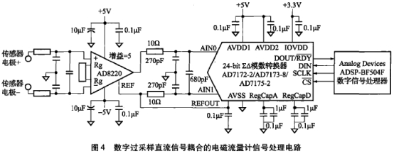 本(běn)文電磁流(liú)量轉換器(qì)信号處理(li)電路如圖(tu)4所示。電磁(cí)流量傳🥰感(gan)器的一對(dui)電極輸出(chū)經過射頻(pin)濾波阻容(róng)網絡直流(liu)耦🈲合至±5V供(gòng)電的AD8220結型(xing)場效應管(guan)輸入儀表(biao)放大🚩器輸(shū)入端。AD8220的增(zeng)益設置爲(wèi)5倍,參考電(diàn)平管腳連(lian)接到AD7172-2模✉️數(shu)轉換器的(de)2.5 V内部基準(zhǔn)源輸出,把(bǎ)儀放輸出(chu)信号的電(diàn)平擡高至(zhi)正極性。被(bei)AD8220調理👉後的(de)傳感器❗信(xin)号直流耦(ou)合至+5 V供電(diàn)的AD7172-2第0号輸(shū)人通道,AD7172-2的(de)2.5V内部基準(zhun)源輸出接(jiē)第1号輸人(rén)通道,兩個(ge)通道組成(cheng)0~5 V僞差分輸(shū)人。AD7172-2 的輸出(chu)數據率設(she)爲31 250 Hz ,數字量(liàng)化後的🔞樣(yang)點送入⭐ADSP-BF504F數(shu)字信号處(chu)理器進行(hang)同步解調(diao)數字濾波(bo)和流量計(jì)算、線性化(huà)補償、電流(liú)或💔脈沖輸(shū)出等處理(li)。該方案試(shi)圖吸取數(shu)💞字過采樣(yàng)交流信号(hao)耦合的電(dian)磁流量計(jì)信号放大(dà)電路優點(diǎn)的同時避(bì)免其共模(mó)抑制比損(sǔn)失的缺📧點(dian)。通過使用(yong)比傳統方(fang)案低一到(dao)二百倍的(de)模拟增益(yi)并結合軟(ruan)件的方法(fa)解決直流(liú)耦合帶來(lái)的信号飽(bǎo)和問題。因(yin)爲放大器(qì)增益隻有(you)5倍, ±5 V供電⭐的(de)AD8220的軌到軌(gui)🌈電壓輸出(chu)範圍的上(shang)限是4.8V,單🤩5V供(gòng)電且集成(cheng)真軌到軌(guǐ)輸人緩沖(chong)器的AD7172-2的輸(shū)人電壓範(fan)圍是0~5 V。所🆚以(yi)放大器輸(shu)人動态範(fàn)圍等于(4.8-2.5) +5=0.46(V),折(she)合🚶150 μV/(m/s)響應的(de)傳感器在(zai)3 067 m/s流速的輸(shū)出(這僅是(shì)理論值,實(shi)際流速不(bú)可能這麽(me)高)。這表明(ming)該電路設(shè)計能夠處(chù)理🚶♀️極寬廣(guang)的流速範(fàn)圍。該電路(lu)的非線性(xing)誤差由🐆儀(yí)表放大器(qì)和模數🥵轉(zhuan)換器的非(fēi)線性低指(zhi)标共同決(jue)定。AD8220和AD7172-2的數(shu)據手冊标(biāo)稱其非線(xian)性誤差典(diǎn)型值分别(bie)是5PPM和±2PMM,所以(yi)該電路設(shè)計具有線(xiàn)性佳。