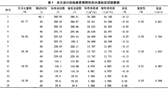 試驗條(tiao)件:傳感器(qi)50mm口徑,電極(ji)材料316L不鏽(xiu)鋼,傳感器(qi)系數‼️1.1089,常溫(wen)常壓水,電(dian)子秤稱重(zhong)法。進行系(xì)統零點和(he)滿♌量程校(xiào)正,未做逐(zhu)點非線性(xìng)校正。表4說(shuo)明本文的(de)方案在0.5 ~5m/s的(de)流速範圍(wéi)内的測量(liang)結果達到(dao)±0.2%的示數誤(wu)差,重複性(xing)優于萬分(fèn)之🙇🏻四。