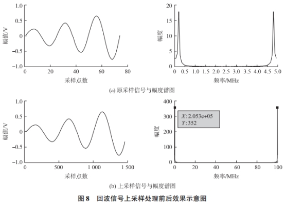 采樣(yàng)信号x[n]與(yǔ)經過L=20進(jìn)行上采(cǎi)樣處理(li)後信号(hao)xu[n]的數據(jù)🈲與幅度(du)譜圖如(rú)圖8(a)和圖(tú)8(b)所示,結(jié)果表明(míng)上采樣(yang)處理⚽後(hou)的信号(hao)采樣率(lü)增大了(le)20倍,同時(shi)處理後(hou)的數據(jù)曲線光(guāng)滑,證明(ming)上采樣(yang)處理符(fu)合🏃預期(qi)效果。