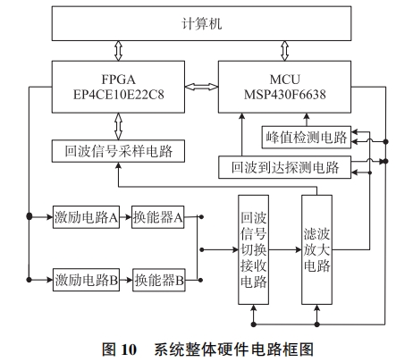 采用(yong)MSP430F6638芯片作(zuo)爲核心(xin)控制單(dan)元,負責(zé)整個測(cè)量過程(chéng)☔中時序(xu)和✍️所🔞屬(shu)電路的(de)控制。FPGA模(mó)塊用以(yi)産生驅(qū)動電路(lù)的觸發(fa)脈沖以(yi)及對采(cai)樣數據(jù)進行實(shi)時獲取(qu)與存儲(chu),如圖10所(suǒ)示。包括(kuò)兩路激(jī)勵🥵電路(lù)、切換接(jiē)收電路(lù)、回波信(xìn)号♊處理(lǐ)電路(濾(lǜ)波放大(da)電路、回(huí)波到達(da)電路、峰(feng)值檢測(cè)電路)和(he)信号采(cǎi)樣電路(lu)等。激勵(li)電路将(jiāng)觸發脈(mò)沖進行(hang)推挽放(fàng)大後輸(shū)人到超(chao)聲波換(huan)能🌈器并(bìng)使其發(fā)射超聲(sheng)波。回波(bō)信🏃🏻♂️号接(jiē)收後經(jīng)過回波(bo)到達探(tàn)🌐測電路(lu)産生一(yī)個回波(bō)到達信(xin)号再☁️輸(shū)入到單(dān)片☀️機。MSP430單(dan)片機通(tong)過内部(bu)AD對經過(guò)峰值檢(jian)測電路(lu)的回波(bō)信号進(jin)行采集(jí),獲得回(huí)波㊙️的最(zuì)大峰值(zhí)。放大後(hou)的回波(bo)信号由(you)FPGA配合高(gao)速AD以及(ji)RAM進行模(mo)數轉換(huan)和數據(jù)存🤟儲,采(cai)🛀集到的(de)數據通(tong)過485通信(xìn)電路傳(chuan)輸到計(ji)算機進(jìn)行數據(jù)處🙇🏻理。