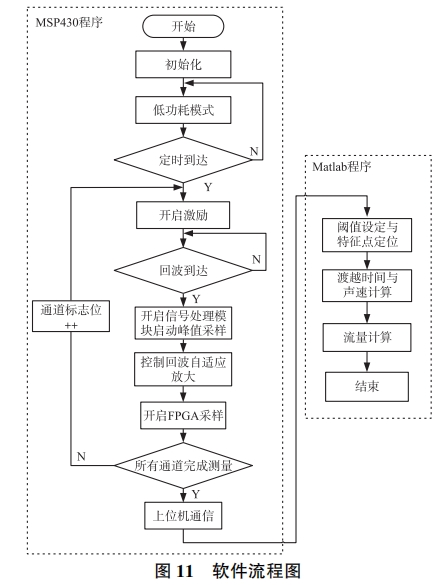 MSP430程序(xù)流程如(ru)下所述(shu)。系統初(chū)上電後(hòu),MSP430F6638将對I0口(kǒu)、定時器(qì)及FPGA模🚶♀️塊(kuài)🏃♀️等各.個(gè)參數進(jìn)行初始(shǐ)化并進(jin)人低功(gōng)耗模式(shì)。定時器(qì)達到0.5s時(shí),微💁處理(li)器控制(zhì)FPGA芯片産(chǎn)生激勵(li)信号輸(shu)人到指(zhi)定🌐的發(fā)射換能(néng)器中。當(dāng)單片機(ji)接收到(dao)回波到(dào)達信号(hao)後,,微控(kòng)制器使(shi)能FPGA對處(chu)理後的(de)回波信(xìn)号進行(hang)采🐅樣并(bìng)存儲在(zai)FPGA的RAM中,同(tong)時開啓(qi)單片機(ji)内部AD對(duì)回波最(zui)大峰值(zhi)電壓進(jin)行采集(ji)。随後,通(tong)過上位(wei)機通訊(xùn)将采集(ji)到✌️的回(hui)波數據(jù)傳輸到(dào)MATLAB程序。MATLAB程(cheng)序首先(xiān)根據回(huí)波相似(sì)度計算(suan)定位到(dao)回波信(xin)号的特(te)征❗點,其(qí)次以特(te)征點爲(wèi)基礎結(jie)合采樣(yàng)頻率和(hé)互相關(guān)法得到(dào)精度高(gao)的飛行(háng)時間差(chà)以及實(shí)時聲速(su)值,利🍉用(yòng)時差法(fa)計算式(shì)(1)得到瞬(shùn)時流量(liàng)值。