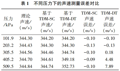 采用本(běn)文的信(xìn)号處理(lǐ)方法和(he)基于TDC-GP22測(ce)量模塊(kuài)的傳㊙️統(tǒng)雙阈值(zhí)法時差(cha)測量方(fang)法(TimeDifferenceMeasurementMethodbasedonTDC-GP22ModuleofDoubleThresholdMethod,TDM-DT)進行(háng)對比。由(yóu)于在測(ce)量🚩過程(cheng)中時差(cha)值難以(yi)直觀表(biao)示,而聲(shēng)速測量(liàng)與時差(cha)測量均(jun1)以飛行(hang)時間爲(wei)基礎,因(yin)此在各(ge)🐉個壓力(li)下比較(jiào)兩種方(fang)法測量(liang)得到的(de)聲速值(zhi)與理論(lun)聲速值(zhí)來間接(jiē)驗證測(cè)🐇量的穩(wěn)定性,結(jié)果如表(biǎo)1所示。