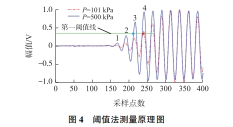 目前廣(guǎng)泛使用(yòng)的特征(zheng)點定位(wei)方法是(shi)雙阈值(zhí)法,其⚽原(yuán)理如圖(tú)4所示。第(di)一阈值(zhi)線電壓(yā)值約爲(wei)0.35V,0V幅值線(xiàn)作爲第(dì)二阈值(zhi)用于定(dìng)位到過(guo)零采樣(yàng)點,即回(hui)波特征(zheng)🔱點。在不(bú)同流量(liang)或工況(kuàng)下,回波(bo)✨信号的(de)幅值特(te)性會發(fā)生變化(hua)。此時若(ruò)采用固(gù)定阈值(zhí)來确定(ding)回波信(xin)号💘特征(zhēng)點,會造(zao)🌐成飛行(háng)時間測(cè)量存在(zài)數個周(zhōu)期的誤(wù)差。如圖(tú)4所示,當(dang)環境壓(ya)力從500kPa變(bian)🚶化爲101kPa時(shi),原本通(tong)🚶過第一(yi)阈值定(dìng)位的第(dì)三個波(bo)形會錯(cuò)誤地定(dìng)位在第(dì)四個波(bo)形,上引(yǐn)起.測量(liang)🔴誤差。改(gai)進的阈(yu)值法結(jié)合不同(tong)的工況(kuàng)來對阈(yù)值進行(háng)調整,然(rán)🐇而在複(fu)雜的測(cè)量環境(jing)下,這些(xie)方法依(yī)♉然存在(zài)👌一定局(ju)限性。