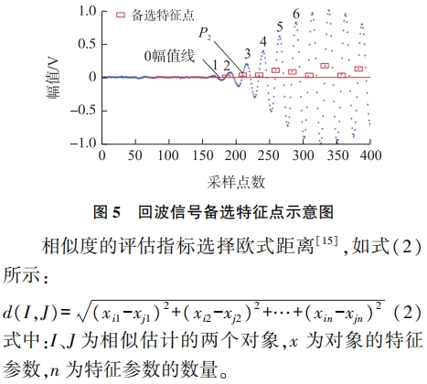 回(hui)波信号(hao)相似度(du)評估選(xuǎn)擇标準(zhun)工況下(xià)的參考(kao)回波信(xin)号☀️I和實(shí)測回波(bō)信号J作(zuo)爲相似(sì)估計對(dui)象。參考(kao)信号第(dì)2,3,4峰值電(dian)壓值與(yu)實測信(xìn)号各個(gè)峰值電(diàn)壓值xi,xj爲(wei)特征參(can)數,參數(shu)數量n取(qu)3。通過計(ji)算,選取(qu)與參考(kǎo)回波信(xin)号歐氏(shì)距離最(zuì)小的一(yi)組🐕實測(cè)回波信(xin)号峰值(zhí),即實際(jì)回波信(xìn)号的第(di)2,3,4波峰值(zhi),将特征(zheng)點準确(que)定位到(dao)實際回(hui)波🏃♀️信号(hao)第2波後(hòu)的過零(líng)點,即圖(tú)5中點P2。