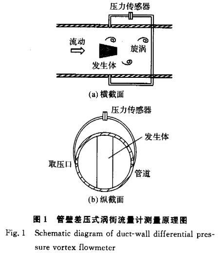 在渦街(jiē)流量計中,有(you)旋渦産生的(de)地方必有壓(ya)力的變化,交(jiāo)替産生的旋(xuan)渦必然會導(dǎo)緻附近流場(chǎng)的壓力出現(xian)規則的變化(huà),其變化的頻(pin)率與旋渦的(de)頻率一一對(dui)應,因此可以(yǐ)通過檢測發(fa)生體尾流中(zhong)某确定的兩(liang)點間的波動(dong)差壓來測量(liang)旋渦頻率,從(cóng)而實現流量(liang)的測量.由于(yú)發生體兩側(ce)對稱點上的(de)相位差爲180°,且(qiě)振動幅度和(he)頻率相等,因(yin)此将差壓取(qu)壓位置選取(qǔ)在管壁上的(de)對稱點更利(lì)于檢測,如圖(tu)1所示,其中圖(tu)1(a)、(b)分别爲沿着(zhe)管道軸向和(hé)徑向的截面(mian)圖.
