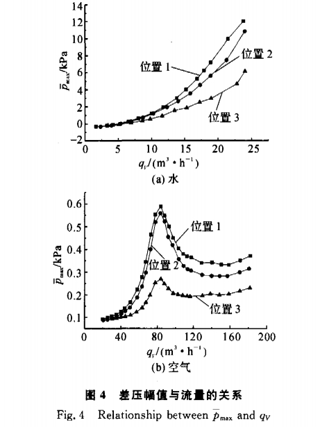 式(shì)中:Pmax.pmin,;分别爲第(di)i個旋渦周期(qī)内管壁差壓(yā)的最大值和(hé)最小值;N爲檢(jiǎn)測的總周期(qi)數. `Pmx值反映了(le)旋渦強度的(de)大小,應随流(liu)量的增加而(ér)增大.實驗`Pmx與(yu)qv的關系如圖(tu)4所示,當圖4(a)中(zhōng)給出的是流(liú)動介質爲水(shuǐ)時,從3對不同(tong)取壓位置測(cè)量的`Pmx随qv的分(fen)布情況,可見(jian)3條曲線均随(sui)qv的增加而單(dan)調遞增,較好(hao)地符合了理(lǐ)論預測;圖4(b)中(zhong)所示的是流(liu)動介質爲空(kōng)氣時的情況(kuàng),3條曲線的形(xíng)狀相似,當qv<83m3/h,`Pmx随(suí)流量的增加(jiā)而增大,在qv=83m3/h附(fu)近取得極大(dà)值,當qv>83m3/h,`Pmx不再随(sui)流量的增加(jia)而增大,而是(shi)急劇下降直(zhi)至qv>120m3/h後逐漸平(ping)緩遞增.