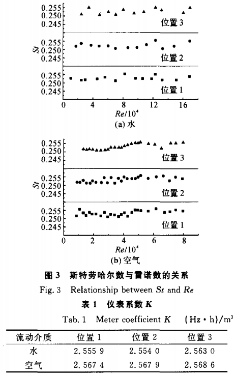 因此(cǐ)要求在一定(ding)的雷諾數Re範(fan)圍内St保持不(bu)變.不同流動(dòng)介質、不同取(qǔ)壓位置的St與(yu)Re的對應關系(xi)如圖3(a)、(b)所示.各(gè)種情況的St基(ji)本上保持爲(wèi)常數,且它們(men)的值均相等(deng),約爲0.253.各種情(qing)況的儀表系(xì)數列于表1,它(ta)們之間的最(zui)大相對誤差(cha)小于1%,這表明(ming)在旋渦發生(shēng)體後一定的(de)距離内,流動(dong)介質和取壓(ya)位置對管壁(bì)差壓式渦街(jiē)流量計的測(ce)量影響很小(xiǎo).