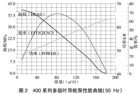 潛油電泵機組都(dou)遵循GB/T16750--2015《潛油電泵機(jī)組》,出庫的時候🛀都(dōu)會進行泵性能測(ce)試,繪制泵性能曲(qǔ)線,也就是泵揚程(chéng)、排量、泵效、軸功率(lü)曲線”。要求至少采(cǎi)集13個點,即在不同(tong)排量下的壓力、泵(beng)效、功率數據,來給(gěi)定泵的有效高效(xiao)區間,用以指導.用(yong)戶生産。圖2爲50Hz工頻(pín)運行的數據曲線(xian),給定的高效區爲(wei)40~150m3/d。