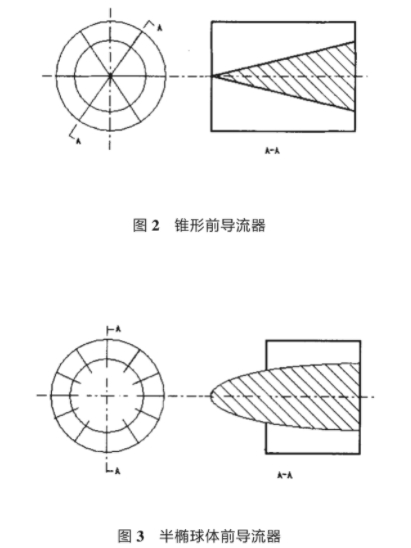 圖2和圖3分(fèn)别爲兩種結構的(de)前導流器示意圖(tu)。圖2爲渦輪流量計(ji)常用結構,葉片數(shù)爲6導流.體形狀由(you)流入至流出呈錐(zhui)形,葉片長與錐體(ti)高度相同.圖3爲本(běn)文改進的前導流(liu)器結構示意圖其(qí)主要特點是将錐(zhuī)體改爲半橢球體(ti),葉片數增加到12并(bing)把葉片長度縮小(xiǎo)1/3.