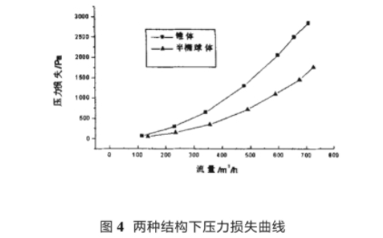 圖4是兩種結構下(xià),流體經過流量計(jì)後的壓力損失曲(qu)線。由圖🧑🏾🤝🧑🏼4可看出在(zai)流量<100m³/h時,壓力損失(shi)不受導流器結構(gòu)的影響而且壓損(sǔn)很小。随着流量增(zēng)大,改進的導流器(qì)的壓損明顯低于(yú)錐體導流器在最(zui)大流量600m³/h處錐體的(de)♈壓損約爲半橢球(qiú)體的2倍,可見導流(liu)器的結構對流量(liàng)計壓力損失有不(bú)容忽視的影響作(zuo)用。