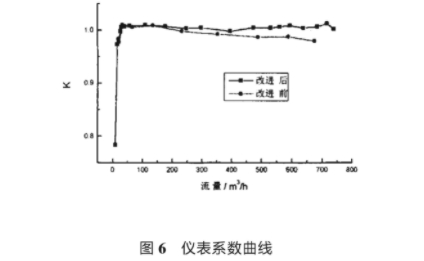 圖(tu)6爲分别采用錐體(tǐ)和半橢球體導流(liu)器,流量計儀表系(xì)數的🧡測試結果。由(yóu)圖可看出采用改(gai)進的導流器後流(liú)量計儀表系數比(bǐ)改進前有較好地(dì)改善在量程範圍(wéi)内50m³/h~600m³/h),K很好地體現常(cháng)系數的特性甚至(zhi)在超過最大量程(cheng)後能繼續保持水(shuǐ)平直線狀态。改進(jìn)前的流量計K值也(ye)較好,但随着流量(liàng)增大直線略向下(xia)傾斜偏離了水🔞平(píng)位置。