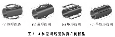 工業生(sheng)産中廣(guǎng)泛應用(yong)的勵磁(ci)線圈的(de)形狀主(zhu)要有圓(yuan)形線圈(quān)、菱形線(xian)圈矩形(xíng)線圈、馬(ma)鞍形線(xiàn)圈等。4種(zhǒng)勵磁線(xian)圈的仿(pang)真幾何(hé)模型如(rú)圖2所示(shi)。典型的(de)線圈結(jié)構仍存(cun)在一些(xie)不足,如(ru)亥姆霍(huò)🔱茲線圈(quān)中部的(de)工作磁(cí)場均勻(yun)度較好(hǎo),而邊緣(yuán)處磁場(chang)卻減弱(ruò);菱形勵(li)磁線圈(quān)和矩形(xing)勵磁線(xiàn)圈産生(shēng)的工作(zuo)磁場在(zài)電極附(fu)近的分(fen)布均📧勻(yun)度較差(chà);馬鞍形(xing)🔞勵磁線(xian)圈的磁(ci)場.均勻(yún)度最好(hǎo),但輸出(chu)感應電(dian)🙇♀️動勢大(dà)小比亥(hai)姆霍茲(zī)線💃🏻圈🐅低(dī)。