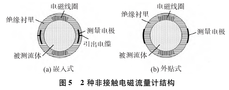 非(fei)接觸式(shì)電磁流(liú)量計的(de)電極與(yǔ)被測流(liu)體間有(you)絕緣襯(chen)🔴裏隔⁉️離(lí)🐇或者直(zhi)接采用(yòng)絕緣測(cè)量管。電(dian)極貼于(yu)測量🛀管(guan)外面或(huò)鑲嵌♍于(yú)測量管(guǎn)内部。非(fēi)接觸式(shi)電磁流(liu)量計利(lì)用電💘極(ji)與被測(ce)流體通(tōng)過絕緣(yuan)襯裏形(xing)成耦合(hé)電容來(lai)檢測被(bèi)⭐測流體(tǐ)流量信(xin)号。主♍要(yào)結構形(xíng)式按電(dian)極的🏃♀️安(ān)裝位置(zhì)可分爲(wei)兩種:電(dian)極嵌人(rén)測量⛷️管(guǎn)絕緣襯(chen)裏🌈(嵌人(ren)式)、電極(ji)貼在測(ce)量管外(wai)(外貼😘式(shi))。嵌💰入式(shì)電磁流(liú)量計和(hé)外貼式(shi)電磁流(liú)🚩量計的(de)結構如(ru)圖5所示(shì),嵌人式(shì)結構和(hé)普通電(diàn)磁流量(liàng)計電極(jí)結構類(lèi)似,而外(wài)貼式多(duō)是采用(yòng)陶瓷🔆表(biao)面金屬(shu)化将電(diàn)極貼在(zài)流量計(ji)測量管(guǎn)外部🧡。