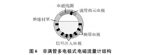 1)非滿管(guǎn)多電極(jí)式電磁(cí)流量計(jì)。其測量(liang)管壁上(shàng)具有多(duō)✔️對電🏃♂️極(ji),其中1對(duì)信号注(zhù)人電極(ji)設置在(zài)測量管(guǎn)底部,用(yong)✉️于滿管(guǎn)狀态判(pan)别的滿(mǎn)管指示(shì)電極設(she)置在測(cè)量管頂(dǐng)部,其餘(yú)3對電極(ji)爲測量(liàng)電極設(shè)置在測(cè)量管兩(liǎng)側,用于(yú)管道流(liu)體液.位(wèi)和流🔞速(sù)信号的(de)測量。當(dang)對液位(wèi)進行測(cè)量時,将(jiang)電壓🏒幅(fú)值恒定(ding)的交流(liu)信号施(shi)加于信(xin)号注人(ren)電極上(shàng),在流體(tǐ)滿管情(qíng)況下,該(gai)流量計(ji)的功能(néng)💰與普通(tōng)的電磁(ci)流量計(ji)相🔆同,因(yīn)爲此時(shí)流體㊙️流(liu)經橫截(jie)面積是(shi)💔固定的(de),隻需根(gēn)據感應(ying)電動勢(shi)推出被(bei)測📐流體(tǐ)的流速(su),進而計(jì)算得到(dào)流量值(zhí)。當流體(ti)未充滿(man)管道時(shí),滿管指(zhi)📧示電極(ji)檢測到(dao)管道流(liú)體爲非(fei)滿管狀(zhuang)态,并利(lì)用算法(fǎ)⭕對測量(liang)值進行(háng)修正,此(ci)時流量(liang)計的測(ce)量方式(shi)則是測(ce)量流體(tǐ)流速和(he)非滿管(guan)流體液(ye)🎯位高度(dù)。通過測(ce)量管内(nei)被測液(ye)體的耦(ǒu)合,反映(ying)液位高(gāo)度變化(hua)的合成(cheng)信号可(kě)以通過(guo)3對測量(liàng)☀️電極得(dé)到,液位(wèi)高度🌈的(de)準确測(cè)量值是(shi)通過轉(zhuǎn)換器将(jiang)合成信(xin)号🌈轉換(huan)獲得。非(fēi)滿管多(duō)電極電(dian)✊磁流量(liàng)計結構(gou)簡圖如(rú)👄圖6所示(shi)。