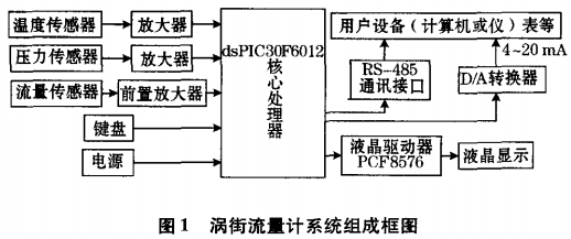 根據(jù)渦街流量計的特(tè)點和數字信号處(chù)理的運算要求,選(xuan)擇了🤩dsPIC30F6012單片機作爲(wèi)核心部件,它是一(yi)種16位微處理☁️器。其(qí)内部集成有1個16位(wei)CPU和1個DSP内核,當内部(bù)時鍾頻率爲最高(gao)120MHz時,進行1次🏃🏻16bitx16bit運算爲(wèi)8.3ns等特點。系統組成(cheng)主要包括:檢⁉️測電(diàn)路、放大電路、顯示(shi)電路、通信接口電(diàn)路等,其系統組成(chéng)框圖如圖1所示。渦(wō)街傳感器采集流(liu)量信号,壓力、溫度(du)傳感器采集流體(ti)溫度、壓力信号對(duì)流量🆚信号加以實(shi)時補償和修正。