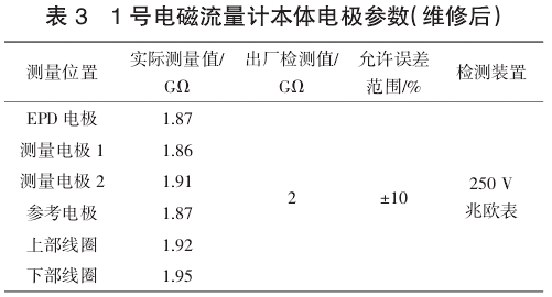 打開密(mi)封後,發現1号電(diàn)極位置有進水(shuǐ)現象,導緻電磁(cí)線圈和電極安(an)裝部位發生鏽(xiù)蝕絕緣失效。對(dui)1号電極進行除(chu)鏽‼️處理并壓緊(jin),對其他3個電極(jí)安裝環進行除(chú)鏽,同時更換所(suo)有連接導線,再(zài)次測試電磁✌️流(liú)量計本體電極(ji)參數(表3)。