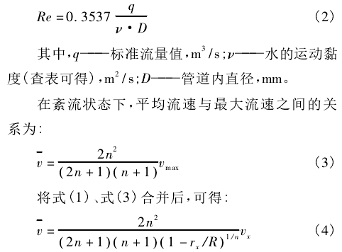 其中(zhong),vx一距離管道(dào)中心線rx的流(liu)速,m/s;Umax管道中心(xīn)線的流速,m/s;r,--流(liú)速測點與管(guan)道中心線的(de)距離,m;R一管道(dao)内半徑,m;n一随(sui)雷諾數不🌈同(tong)而變化的指(zhǐ)數。