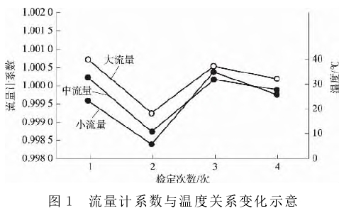 檢定過程(chéng)中,一般按被檢流(liú)量計額定流量的(de)70%,50%,30%設爲大、中、小流量(liang)檢定點,通過對流(liú)量計在線采集的(de)數據進行分析。選(xuan)用其中變化明顯(xian)的4次檢定流量數(shu)據,流量計系數與(yǔ)溫度關系變📞化如(ru)圖1所示。4次檢定數(shù)據出現規律性的(de)變化,其變化趨勢(shi)和檢定油溫☀️變化(hua)趨勢一🍉緻,說明原(yuán)油溫度的高低決(jué)定了流量計系數(shù)的大小。
