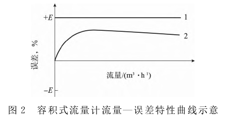 通過查找對各(ge)種容積式流量計(jì)進行檢定試驗的(de)大量數據,可得出(chu)容積式流量計的(de)實際誤差曲線如(rú)圖2中曲♌線2。