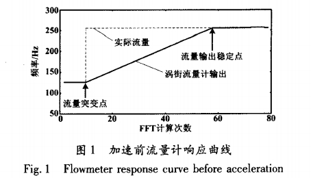 采用頻譜估(gū)計方法分析渦(wo)街信号的頻率(lǜ)是基于渦街流(liú)量計信号是一(yi)個平穩随機過(guo)程信号,并且流(liú)量在短時間内(nei)是穩定的或變(bian)化很小。由于渦(wō)街流量計輸出(chu)信号實時性的(de)要求,隻能對有(you)限長時間段内(nei)的信号進.行處(chù)理,即隻能截取(qǔ)一段數據進行(háng)頻譜分析。爲了(le)防止數據統計(jì)變異性對計算(suàn)渦街頻率的影(yǐng)響,必須對若幹(gan)次頻譜分析的(de)結果進行平均(jun),這就需要花費(fei)時間。當平均次(cì)數多時,數字渦(wō)街流量計的響(xiǎng)應速度就會顯(xiǎn)得比較慢。例如(rú),我們的系統采(cai)用時鍾頻率爲(wèi)40MHz的TMS320LF2407ADSP芯片,使用彙(hui)編語言編制FFT程(chéng)序計算渦街信(xin)号的頻譜,對50次(cì)計算結果進行(hang)平均。每次FFT計算(suan)時間大概是300ms(包(bāo)括信号處理,人(rén)機接口等對應(ying)的其他軟件執(zhi)行時間),總用時(shi)大概爲15s,這個時(shi)間比較長。若在(zai)這段時間裏,流(liu)量發生突然變(biàn)化,系統就需要(yao)計算50次FFT,才能反(fǎn)映流量的變化(huà),這将造成測量(liang)誤差,如圖1所示(shì)。