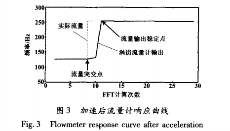圖3爲經過(guo)加速處理後40口(kǒu)徑渦街流量計(ji)在流量突變時(shi)的響應曲線。可(ke)見,在流量突變(bian)後,系統經過3次(ci)FFT計算就能跟上(shang)流量的變化,有(yǒu)效地提高了流(liu)量計的響應速(sù)度。