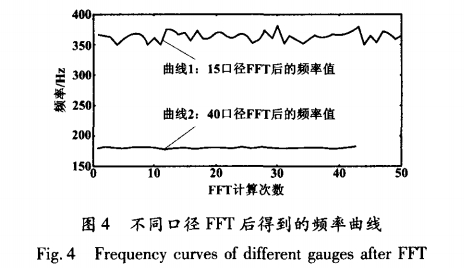 在小流(liu)量的時候渦街(jiē)流量計信号微(wei)弱,信噪比降低(dī),信号質量比較(jiào)差,頻譜分析得(de)到的渦街頻率(lǜ)波動比較大。特(tè)别是小口徑渦(wo)街流量計,由于(yú)傳感器安裝等(děng)原因,這種現象(xiàng)更爲明顯。圖4中(zhong),曲線1爲15口徑渦(wō)街流量計在下(xia)限頻率附近,每(měi)次FFT計算得到的(de)渦街頻率;曲線(xian)2爲40口徑離下限(xiàn)頻率比較遠時(shí)每次FFT計算後得(dé)到的渦街頻率(lǜ)。可見,曲線1波動(dong)較大,數值約爲(wèi)30Hz。此時,即便采取(qu)平均措施,也無(wu)法使輸出頻率(lü)值穩定。