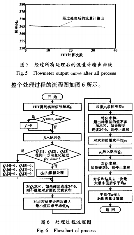 式中:ƒin爲處(chu)理後隊列Q1[N]中的(de)頻率值;f。爲處理(lǐ)前隊列Q1N]中的頻(pin)率值,即原先FFT計(ji)算出來的頻率(lǜ)值;f,爲流量計最(zuì)近--次輸出的頻(pin)率值;c爲常數,可(kě)以根據實際情(qíng)況選取,實驗中(zhōng)取1。需要注意的(de)是,這裏是對Q1[N]處(chù)理,而不是對隊(duì)首元素Q1[1]處理。原(yuan)因是,Q1[1]~Q1[N-1]中的信息(xī)會反映流量的(de)突變,如果對其(qí)進行限幅處理(li),會影響系統的(de)響應速度。