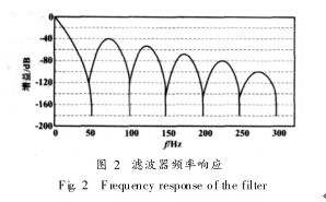 式中(zhōng): fs爲采樣(yàng)頻率; AD7714采(cai)樣頻率(lü)爲 1912 kHz ; N爲濾(lü)波采樣(yàng)個數; f 爲(wei)數字濾(lǜ)波器🍓響(xiǎng)應頻率(lü)。通過設(shè)定濾波(bō)采樣個(ge)數可☁️以(yi)改變數(shù)字濾㊙️波(bō)器的截(jié)止頻率(lü)和一次(ci)陷波頻(pin)率。在本(ben)設計中(zhōng)綜合考(kǎo)慮🔱模數(shu)轉換速(sù)度和去(qù)除噪聲(shēng)性能, 設(she)置🌐 N 值使(shi)濾波🌍器(qi)截止頻(pín)率爲 50 Hz, 濾(lǜ)波🔞器頻(pin)域響♌應(ying)如圖 2所(suǒ)示, 濾波(bō)器對工(gong)頻 50 Hz及其(qi)偶次諧(xie)波有很(hen)好的抑(yi)制作用(yòng)。
