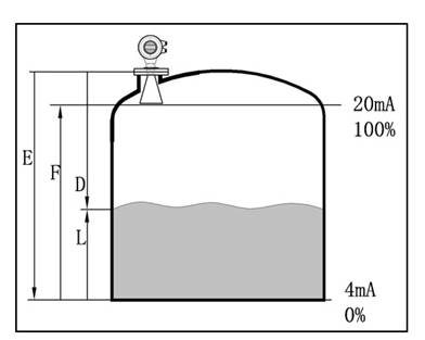 通過(guo)輸入空罐高度(dù)E(=零點),滿罐高度(dù)F(=滿量程)及一些(xiē)應🏒用參🏒數㊙️來設(shè)定,應用參數将(jiāng)自動使儀表适(shì)應測量環境。對(dui)應于4-20mA輸出🏃♀️。